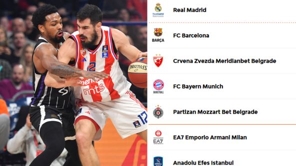 Real Madrid, Barselona, Crvena zvezda i Bajern Minhen imaju skor 13-10 i zauzimaju pozicije od šest do devet, a zatim slede timovi sa učinkom 12-11. U toj grupi ekipa su Partizan i Olimpija iz Milana. Šanse da se uključe u borbi za doigravanje imaju još tri tima - Anadolu Efes, Žalgiris i Asvel trenutno su na učinku 11-12.