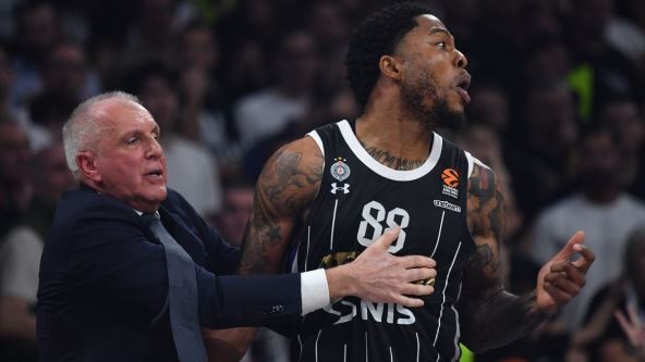 Pokušavao je i trener Partizana Željko Obradović da ga smiri, stao je pred njega i spuštao tenziju, ali teško je bilo Amerikancu da se kontroliše u tim trenucima.