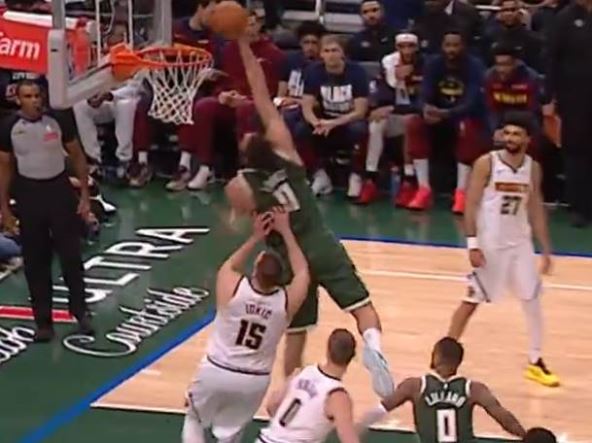 Na jednom od snimaka koji kruži internetom, a podelila ga je pobednička ekipa iz Milvokija, vidi se zakucavanje uz faul baš preko Nikole Jokića. Bruk Lopez je krenuo u prodor sa velike udaljenosti, a Nikola Jokić nije uspeo da ga isprati nogama i već na prvom koraku je mnogo zaostajao za centrom protivničkog tima.