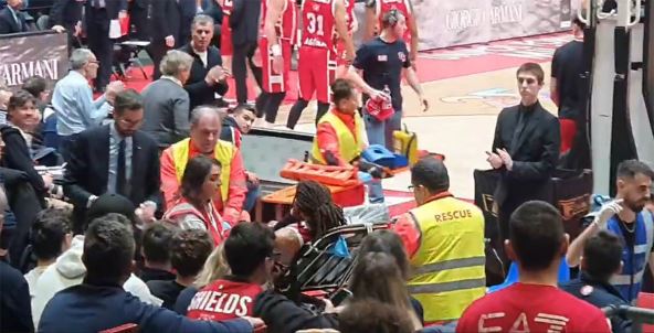 Bivši košarkaš Crvene zvezde Fredi Gilespi (27, 208 cm) doživeo je ozbiljnu povredu na večerašnjem meču Evrolige između njegove Olimpije i Fenerbahčea. Amerikanac je iznet na nosilima sa parketa posle duge pauze, pošto je ostao da leži jer se sudario glavom sa Devonom Holom.