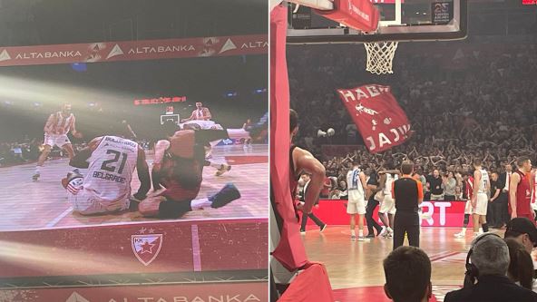 Kakav peh za Crvenu zvezdu u samom finišu utakmice sa Olimpijom iz Milana! Kada se taman razigrao Džoel Bolomboj, kada je uhvatio nekoliko važnih lopti ispod koša za svoj tim i pošto je počeo da postiže i poene u skoku je bio sa Leandrom Bolmarom na minut i po do kraja meča i kada se prizemljivo videli smo jako loše vesti.