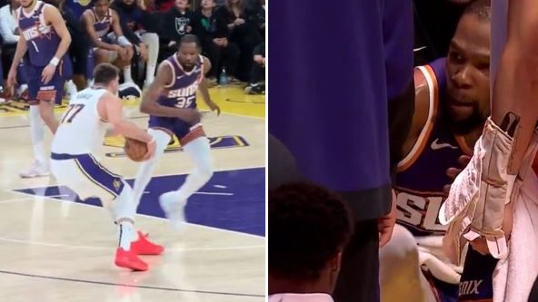Luka Dončić dočekao je Finiks Sanse sa svojim Lejkersima i odmah počeo da "vozi" Kevina Durenta (36). Legendarni NBA veteran pokušao je u jednoj situaciji da odbrani svoj koš od Slovenca, ali je posle niza driblinga izgubio ravnotežu, a Dončić je rešio tu situaciju onako kako to radi u borbi sa visokim čuvarima - dribling, korak unazad i mat - lopta u košu.
