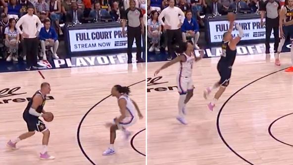 Džamal Marej je organizovao napad Denver Nagetsa, ali je bilo jasno da će Nikola Jokić kao najbolji pojedinac tima rešavati poslednji napad u drugoj četvrtini. Dobio je loptu na vreme, ali je kalkulisao, oklevao i na kraju potrošio mnogo sekundi, pa Oklahoma nije imala vremena za napad nakon primljene trojke. Za Jokića nije bilo druge opcije osim da šutne ka košu Oklahome - što je na kraju i uradio na specifičan način.