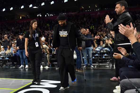 On se kreće uz pomoć štaka, a navijači Partizana su ga pozdravili gromoglasnim aplauzom čim se pojavio u hali.
