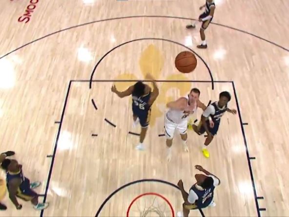 Sve to Nikola Jokić je uradio dok je kontakt sa loptom imao samo jednom rukom. Videlo se u prvi mah da je izveo spektakularan potez, ali su tek uglovi kamere koji su se pojavili dan kasnije otkrili koliku je zapravo majstoriju izveo srpski košarkaš. Dok je levu ruku koristio samo da se zaštiti od čuvara, desna mu je bila dovoljna da obavi sve što je trebalo. Pogledajte tu majstoriju: