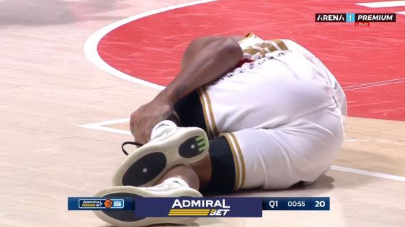 Prekid meča zbog pružanja pomoći Jagu zbog povrede. Nagazio ga je Slovenac Gregor Glas, a sudije su dosudile nesportski faul. Zvezdin plejmejker je izašao iz igre i pruža mu se pomoć.