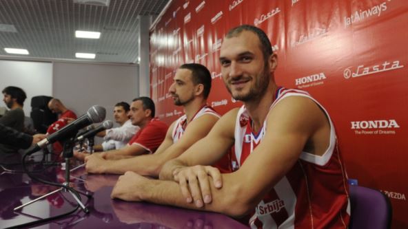 Marko Simonović i Raško Katić, kao dvojica najstarijih košarkaša Crvene zvezde Telekom, u petak su se našli za konferencijskim stolom pored trenera Dejana Radonjića.