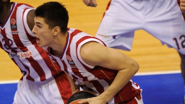 Mladi krilni centar beogradskog tim Luka Mitrović pokušao je da se izbori za poziciju pod košem sa Krisom Bukerom, ali je nezgodno stao i brzo pao na parket.