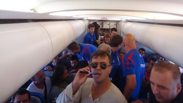 Nakon gromoglasnog pevanja "Igraj i pobedi i ponosno se vrati", skandiranja "Šampioni" i "Krle, ostani", posvećenog kapitenu koji je najavio oproštaj, poznati glumac rešio je da zabavi saputnike tobožnjim porukama nezadovoljstva.