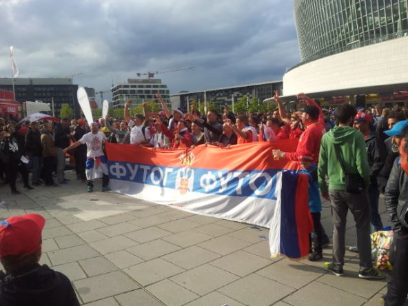 "Ko ne skače, Srbin nije", "Bože pravde, ti što spase", "U boj krenite junaci svi", orilo se platoom ispred "Mercedes-Benz arene" dok su proticali poslednji minuti pred start.