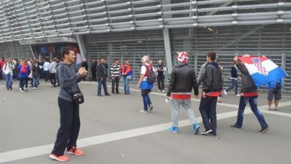 Obučeni u zastave svojih zemalja, Srbi i Hrvati se mimoilaze pred ulazima i u redu, dok čekaju da uđu.