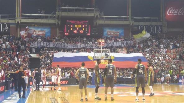 Navijači crveno-belih su na meču 7. kola Evrolige na tribinama razvili i veliku rusku zastavu, ali i transparent kojem su odali počast nedavno ubijenom ruskom pilotu Sergeju Rumjancevu.