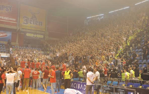 Simonović ga je ove večeri na istom mestu podigao zasluženo, kao pobednik, a saigrači u crveno-belom su mu tim povodom pokrenuli pesmu, koju su brzo prihvatile i Delije: