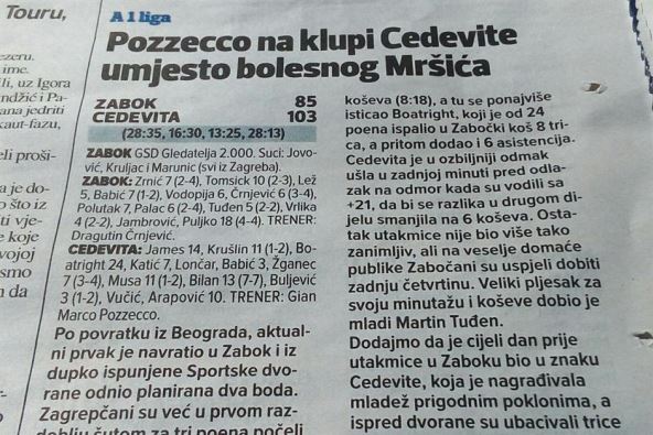 Prvaka Hrvatske u meču sa Zabokom završenim rezultatom 85:103 predvodio je Mršićev pomoćnik, nekada poznati italijanski košarkaš, Đanmarko Poceko.