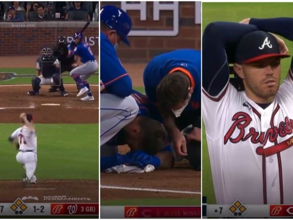Bejzbol igrač Njujork Metsa ostao je da leži na travi, dok je njegov kola koji je bacio lopticu u neverici posmatrao dešavanja na terenu. Na snimku se vidi kako se Veb drži za glavu, dok Pilar u bolovima leži na terenu.