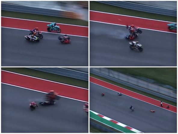 Oncu, vozač Tech 3, je zadnjim točkom dokačio prednji točak Alkobe, vozača Gresini Honde. Njegov motor je pao, a Andrea Minjo i Pedro Akosta nisu imali dovoljno vremena da sve to izbegnu, pa je došlo do stravičnog sudara.