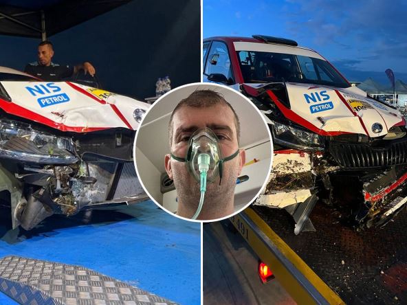 "Dušan je izašao zadnjim levim točkom sa asfalta, nezgodno je zahvatio zemljani i šljunkoviti deo puta pri brzini od 97 km/h i udario je pravo u drvo. Hitna pomoć brzo je reagovala, srpska posada je odvedena u bolnicu na detaljna ispitivanja i ustanovljeno je da nema težih povreda. Sumnjalo se na prelome ključne kosti i rebara kod obojice, ali srećom nisu ozbiljnije povređeni. Zbog oštećenja na automobilu nisu bili u mogućnosti da nastave takmičenje", navodi se u saopštenju.
