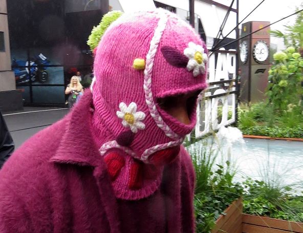 Deluje kao da je od bake dobio "pletivo", a posebno zanimljiva bila je roze fantomka ukrašena cvetnim simbolima, iz koje su mu virile samo oči i deo nosa.