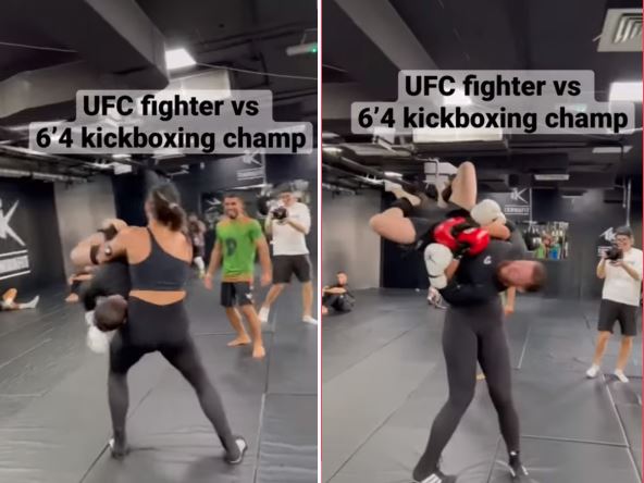 Spektakularan sparing na treningu odradili su UFC borac Merab Dvališvili (31, 168 centimetara) i kikbokserka Katarina Kavaleva (31, 194 centimetra). Oni su zajedno trenirali pred naredne borbe, a Beloruskinja je jedan trenutak nepažnje iskoristila da izvede potez koji je odmah postao hit na društvenim mrežama.