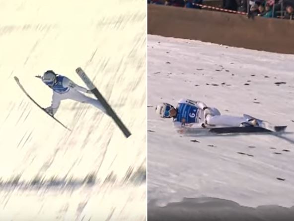 Ipak uspeo je da skijama dovoljno amortizuje pad, a da zbog vetra koji mu je duvao u prsa nije rešio ranije da se prizemlj mogao je da leti i nekoliko metara duže! Srećom na kraju iako je prizor izgledao strašno 22-godišnji Slovenac je sam ustao i izašao sa staze.