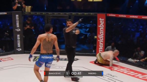 Nakon nekoliko udaraca koje je dobio našao se na podu, a Ribeiro je u tim trenucima već slavio pobedu. njemu je delovalo da je gotovo, a sudija je pustio da se nastavi. Čekao je sudija da vidi da li Vaso može da ustane, čak mu i brojao, pa dozvolio nastavak meča. Pre nego što je povratio ravnotežu Vaso Bakočević se pridržao za kavez, a malo i za sudiju koji je stajao ispred njega. Pogledajte kako je to izgledalo: