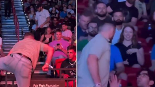 Preplašeni navijač je gledao u Dvališvilija, a onda je poznati MMA borac rešio da ga još više uplaši. Uvhatio ga je za kosu, a onda mu nešto dobacio i pogledao u njega. Na kraju je otišao nazad na svoje mesto bez većih incidenata. Pogledajte tu situaciju: