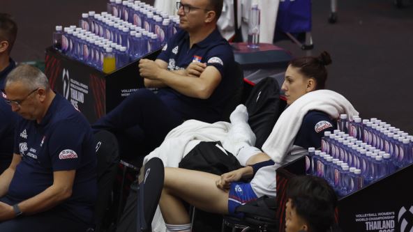 Tijana Bošković povredila se pri doskoku u drugom setu i uz bolnu grimasu otišla na klupu. Nije se oslanjala na tu nogu do kraja mečeva, niti je ustajala, što budi strah da je u pitanju komplikovani problem, koji bi drastično kvario planove srpske selekcije na Svetskom prvenstvu. Pogledajte tu scenu: