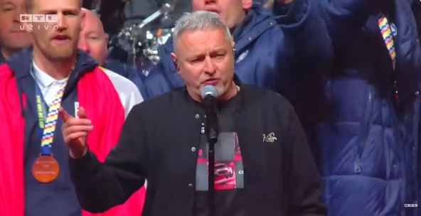 Nakon govora koji je održao otpevao je pesmu "Geni kameni", a posle toga je najavio novu pesmu novim govorom: "Za naše prijatelje, za naše hrabre junake, za naše hrabre junake ćemo otpevati Lijepa li si." Pogledajte opet kako je to izgledalo pre nego što je na zahtev rukometaša otpevana i pesma "Prijatelji":