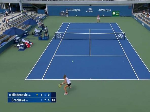 Mladenovićeva je bez problema dobila prvi set 6:1, a u drugom je povela 5:1. Očekivalo se da lako privede meč kraju i dođe do pobede, ali je izgubila servis i Gračeva je došla do 5:2.