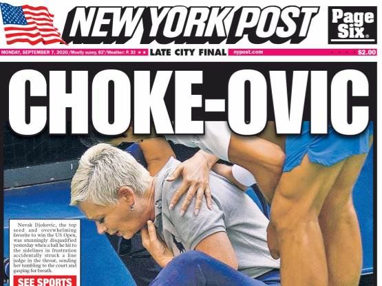 Njujorški tabloid "Njujork post" objavio je na svojoj naslovnoj strani "Novak Čouk-ović" ("čouk"-daviti), sa jasnom aluzijom na to da je 'Broj 1' pogodio linijskog sudiju u vrat.