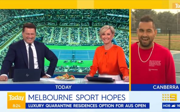 Gost u australijskom jutarnjem programu, "Danas", bio je Nik Kirjos, glavni, pa ne kritičar, već mrzitelj Novaka. Voditelj Karl Stefanović (otac Srbin-Nemac, majka Australijanka( ga je tada upitao kako provodi dana bez tenisa zbog pandemije, jer je igrač propustio i američku turneju, uključujući i US Open.