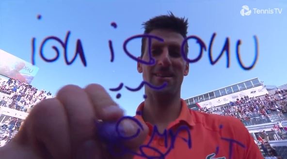 Posle uspeha na terenu na kojem je osvojio pet titula, Đoković je uzeo marker i tradicionalno ostavio poruku na staklu na kameri. Napisao je na italijanskom - "Uno di noi" ("Jedan od nas") i "Te amo Roma" ("Rime, volim te").