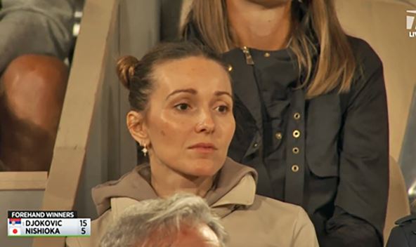 Jelena je s osmehom na licu posmatrala obraćanje Novaka Đokovića koji kao da je još poboljšao svoj francuski, a kamere su je snimile u društvu svoje majke, kao i dobro uigranog trija: trener Goran Ivanišević, fizioterapeut Ulisesa Badijua, kao i agent Edoardo Ataldi.