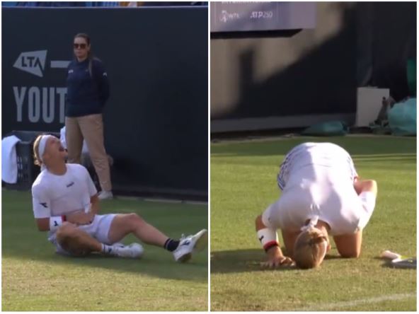 Momak iz Malage je vodio 1:0 u setovima, u drugom je imao meč loptu na 6:5 u taj-brejku, ali je posle greške i izbačene lopte u aut, kao "pokošen" pao na travu i počeo da se previja od bolova.