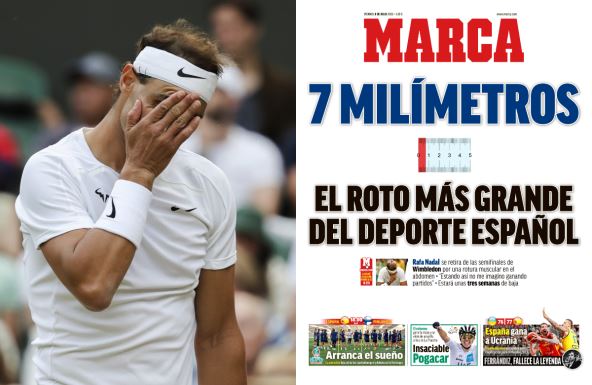 Španski list "Marka" zato na naslovnoj strani na lenjiru pokazuje kako izgleda sedam milimetara, uz poruku da je to "Najveća ruptura španskog sporta". "Rafael Nadal se povukao iz polufinala Vimbldona zbog rupture mišića abdomena. "Ovakav ne mogu da zamislim da pobeđujem", citirane su Rafine reči.