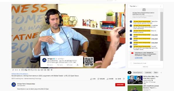 Pokrenut je "lajvstrim" podkasta koji se pušta iznova i iznova, a naslovljen je "Novak Đoković o povlačenju iz tenisa 2023. godine i svađi sa Rafaelom Nadalom, uživo vesti sa US Opena".