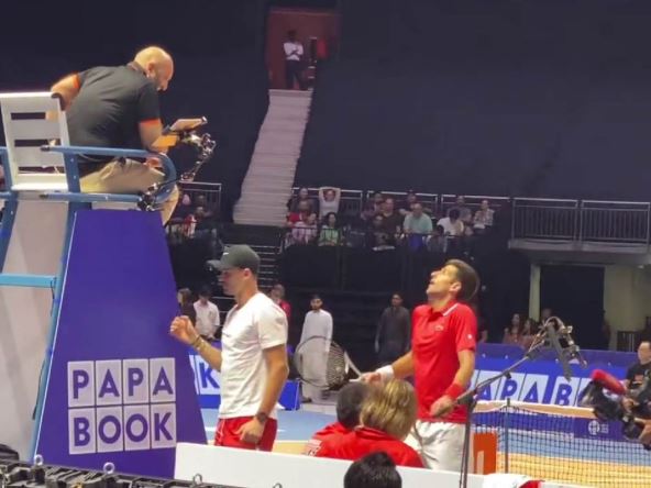U jednom trenutku Đoković je prišao glavnom sudiji jer je bio "nezadovoljan" jednom odlukom, tako da se naslonio na sudijsku stolicu i prodrao: "Zaaaaaašto?". Cela dvorana je odjekivala zbog Novakovog "besa", a publici je sve ovo bilo smešno, pa ni sudija nije dramatično shvatio potez srpskog asa. Videlo se da se šali kao i mnogo puta tokom ove nedelje, a nadamo se da drugi to neće iskoristiti protiv njega, pošto ne bi bilo prvi put da bude na udaru zbog sitnice.