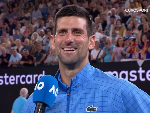 "Zato što sam tako želeo ha-ha!", nasmejao se Đoković i potom se zahvalio svima koji su došli da prate meč u kasnim večernjim časovima: "Ne mogu da kažem da mi je žao što niste gledali dugačak meč, hteo sam da pobedim 3:0, ali to se nikada ne zna u tenisu naravno. Nosiš se sa mnogim stvarima. Prvih nekoliko gemova je bilo tesno, a počeo sam potom da se osećam opuštenije i budem agresivniji, osetio sam da je malo nervozniji i iskoristio sam priliku. Zadržao sam fokus i odigrao najbolji meč u 2023. godini".