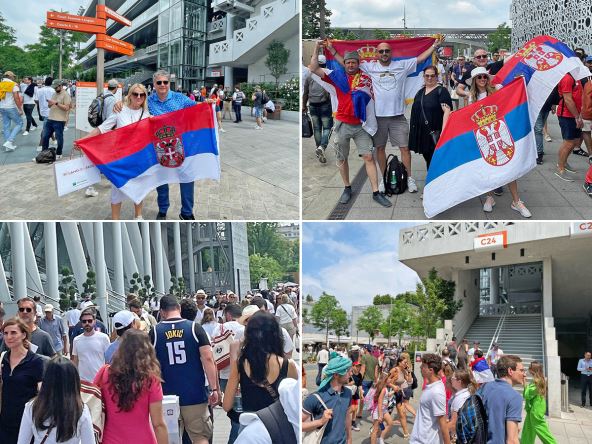 Novak Đoković igra u finalu Rolan Garosa protiv Kaspera Ruda, a navijači su okupirali kompleks u Parizu. Ispred stadiona "Filip Šatrije" nalazi se veliki broj ljudi koji su došli da pruže podršku i da navijaju za srpskog tenisera. Svi imaju neku vrstu obeležja, uglavnom su to srpske zastave zbog kojih su dobili i upozorenje od obezbeđenja.