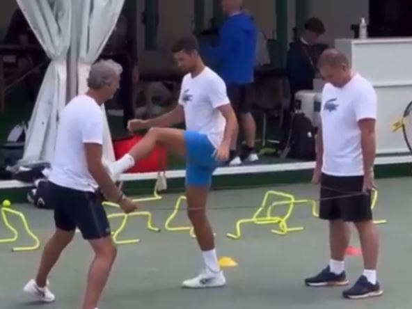 Srpski teniser oglasio se na društvenim mrežama i objavio zanimljiv snimak. Na njemu se vidi kako preskače lastiš i isteže se dok su pored njega Miljan Amanović i Marko Paniki koji drže lastiš rastegnut. Vidi se kako i drugi ljudi prolaze pored i gledaju ka njima. Neće Novak svoj meč početi pre 16 časova u najboljem slučaju. Pre njega na Centralni teren izlaze Elena Ribakina (Kazahstan) i Beatriz Hadad Maja (Brazil). Za to vreme Andrej Rubljov odmara i čeka boljeg iz okršaja srpskog i poljskog tenisera, jer je on svoj deo posla završio u nedelju uveče.