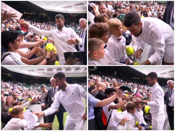Sjajni sedmostruki osvajač Vimbldona savladao je Andreja Rubljova u četiri seta u meču četvrtfinala, a nakon duela mnogo navijača je čekalo da im se potpiše na majice, loptice, papire... Oni namlađi su prednjačili, a grupica dečaka je molila Novaka da im da reket.