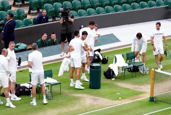 Srpski teniser Novak Đoković od 14.30 igra polufinale Vimbldona protiv Janika Sinera, a na treningu na "Terenu broj 1" sreo se sa potencijalnim rivalom u finalu Karlosom Alkarazom. Španski teniser kasnije popodne igra protiv Medvedeva, a njegov trening bio je zakazan odmah posle Đokovićevog, tako da je bilo neizbežno da će se dvojica najboljih igrača planete susresti.