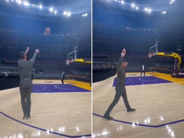 Prvo je imao upoznavanje i druženje sa Stefom Karijem i Lebronom Džejmsom i sa njima je razmenio i poklone. Onda je u dvorani Lejkersa pokazao šta može i sa košarkaškom loptom. Uzeo je, odaljio se van linije za tri poena, namestio se i ubacio i to bez koske. Savršeno.
