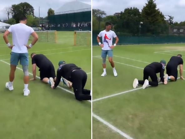 Novak Đoković i Nik Kirjos napravili su pravi spektakl na treningu na Vimbldonu. Prvo je Australijanac držao čas tenisa Srbinu i objašnjavao mu kako treba da igra određene udarce, pa je onda morao da gleda kako članovi njegovo tima puze po vimbldonskoj travi.