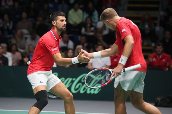 Bilo je muke na početku, ali tada su se Novak Đoković i Hamad Međedović samo zagrevali za okršaj protiv Grka. Impresivnom serijom od pet uzastopnih gemova srpski dubl je osvojio prvi set i sada je na pola puta do trijumfa koji znači i kraj ovog okršaja jer su u subotu popodne Kecmanović i Đoković već doneli dva boda u singlu.