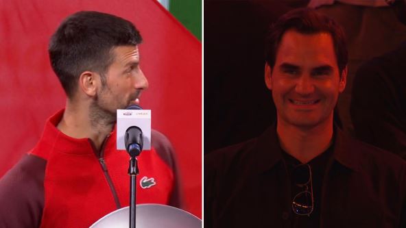 Kada je dobio pehar koji pripada finalisti Novak je stao pred mikrofon i obratio se svom velikom rivalu. "Takođe, lepo je videti Rodžera. Nisam navikao da vidim tebe na tribinama, voleo bih da si ovde na terenu i da igramo", počeo je Novak, na šta je Federer odgovorio osmesima i klimanjem glavom.