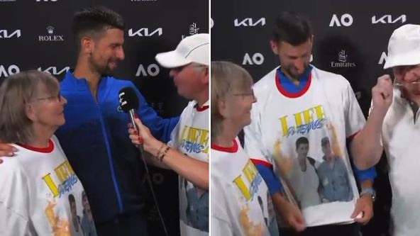 Vremešni Jan i njegova supruga spustili su se do miks zone gde teniseri daju izjave, kako bi pozdravili igrača koga prate već decenijama! Zapravo od prvih pojavljivanja na Australijan openu, od 2008. godine Jan je video šta će i ko će biti Novak Đoković! Sada se Jan pojavio sa suprugom i to u posebnim majicama, majicama na kojima je bila slika Jana i Novaka iz te 2008. godine.