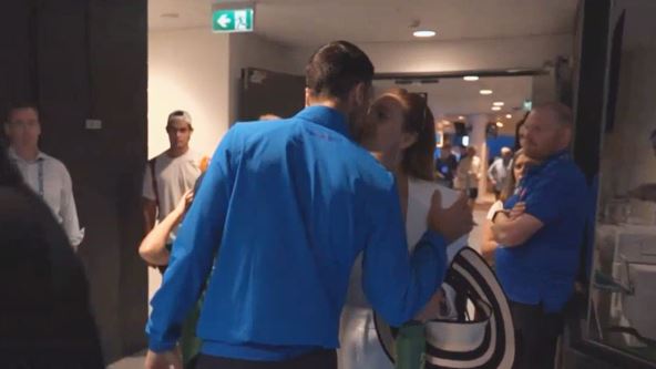 Novak Đoković ljubi Jelenu pred početak meča Izvor: Eurosport TV