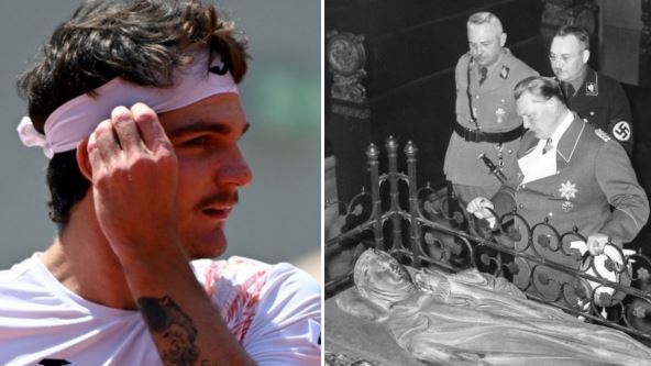/Na slici: Ditrih Klages u crnoj uniformi iza Hermana Geringa, jednog od naistaknutijih nacističkih vođa Nemačke, na grobu Hajnriha Lava, najmoćnijeg nemačkog kneza iz 12. veka/