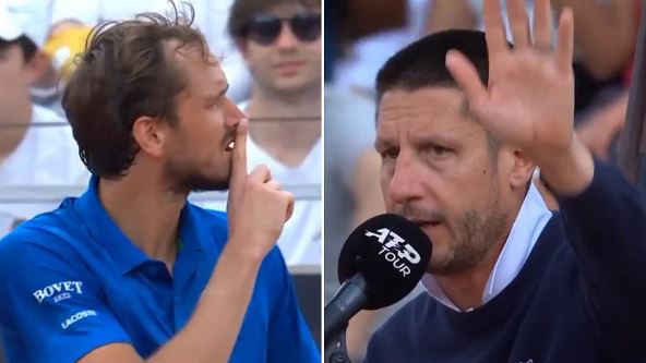 Iskusni ruski teniser koji mrzi da igra na šljaci sada je pružio odličan otpor i daleko dogurao u Rimu, a pri rezultatu 7:5, 5:3 kada je počinjao svoj servis gem okrenuo se ka publici i počeo da im pokazuje da se utišaju. Mahao je prstom ispred usta. Naravno publika je navijala za domaćeg tenisera, a nije hteo Medvedev to da im prećuti.